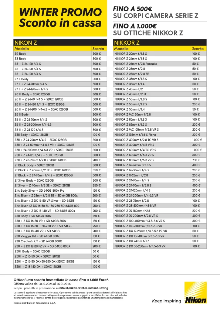 Dal 31/10/25 al 26/01/26 arriva la Winter Promo di Nikon! Sconti pazzi fino a 1000€